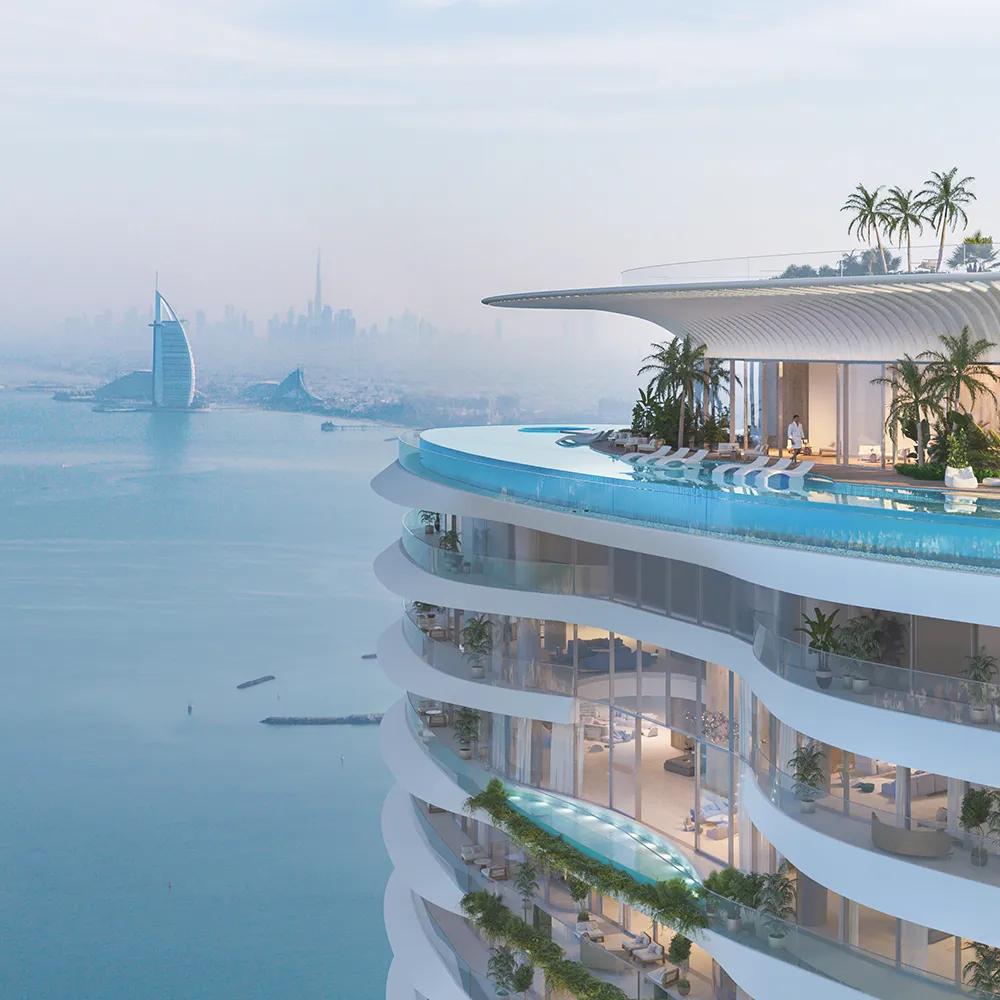 Extremely spacious interiors lead out onto vast terraces embellished with lush greenery and unique private pools. Admire breathtaking views towards Burj Al Arab, Burj Khalifa, Palm Jumeirah, and Ain Dubai as you relax and breath in the fresh sea air. Each exclusive apartment enjoys either 180- or 360-degree panoramic views.